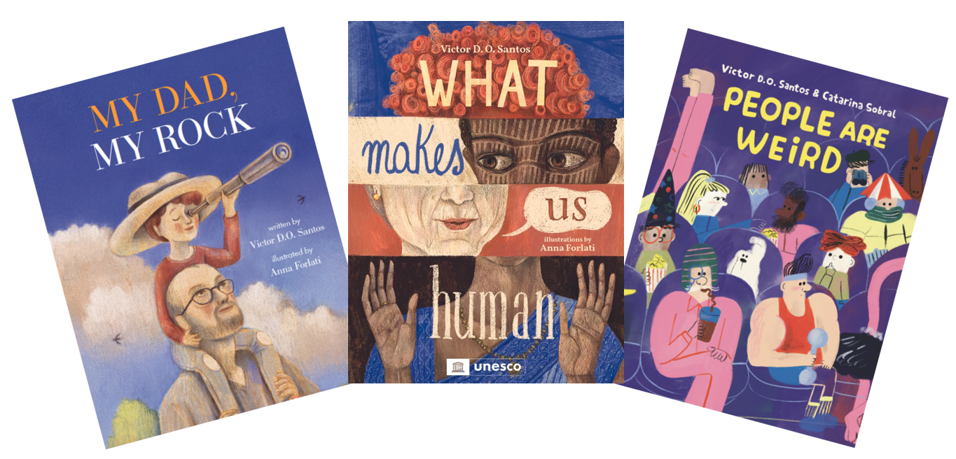 Victor D. O. Santos has been busy lately. The first book he ever shared with me was My Dad, My Rock (before it was picked up for US publishing by Scribble) which was a good fit for a dad running a blog about picture books, and which I included on a Father’s Day picture books list many years ago. His What Makes Us Human is also internationally acclaimed, and, like all of his books, published in many languages across the world. And today you are in luck, because Victor is going to tell us about some future projects with amazing artists like ISOL, Dena Seiferling, and Mara Cerri.