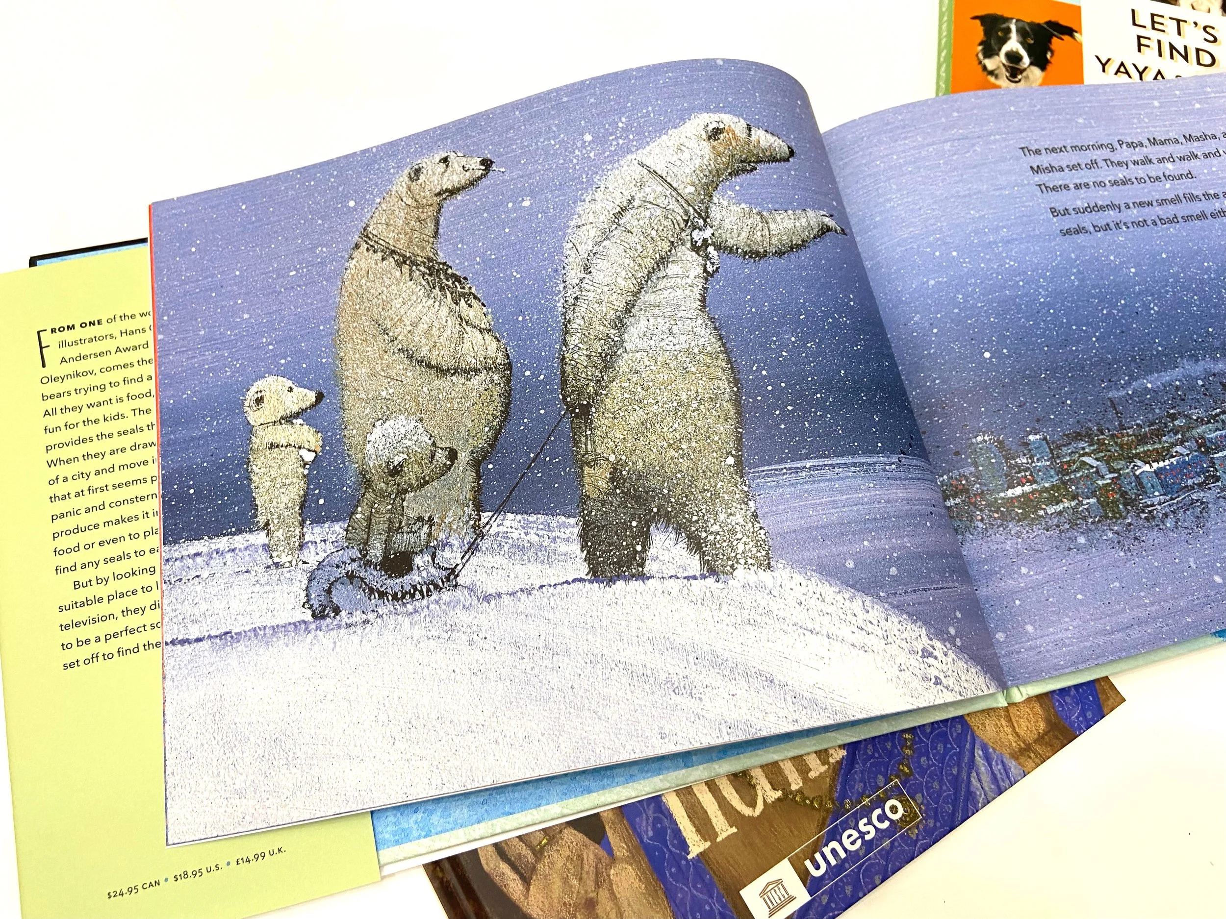 The bear family in this story needs a new home because food is getting scarce - so they wander into a human city. There’s subtle and dry humor in this book that kids will definitely pick up on. It’s hard for the bears to make friends because the “neighbors are weird” - but of course the humans are just running terrified because there are polar bears going into houses looking for food.