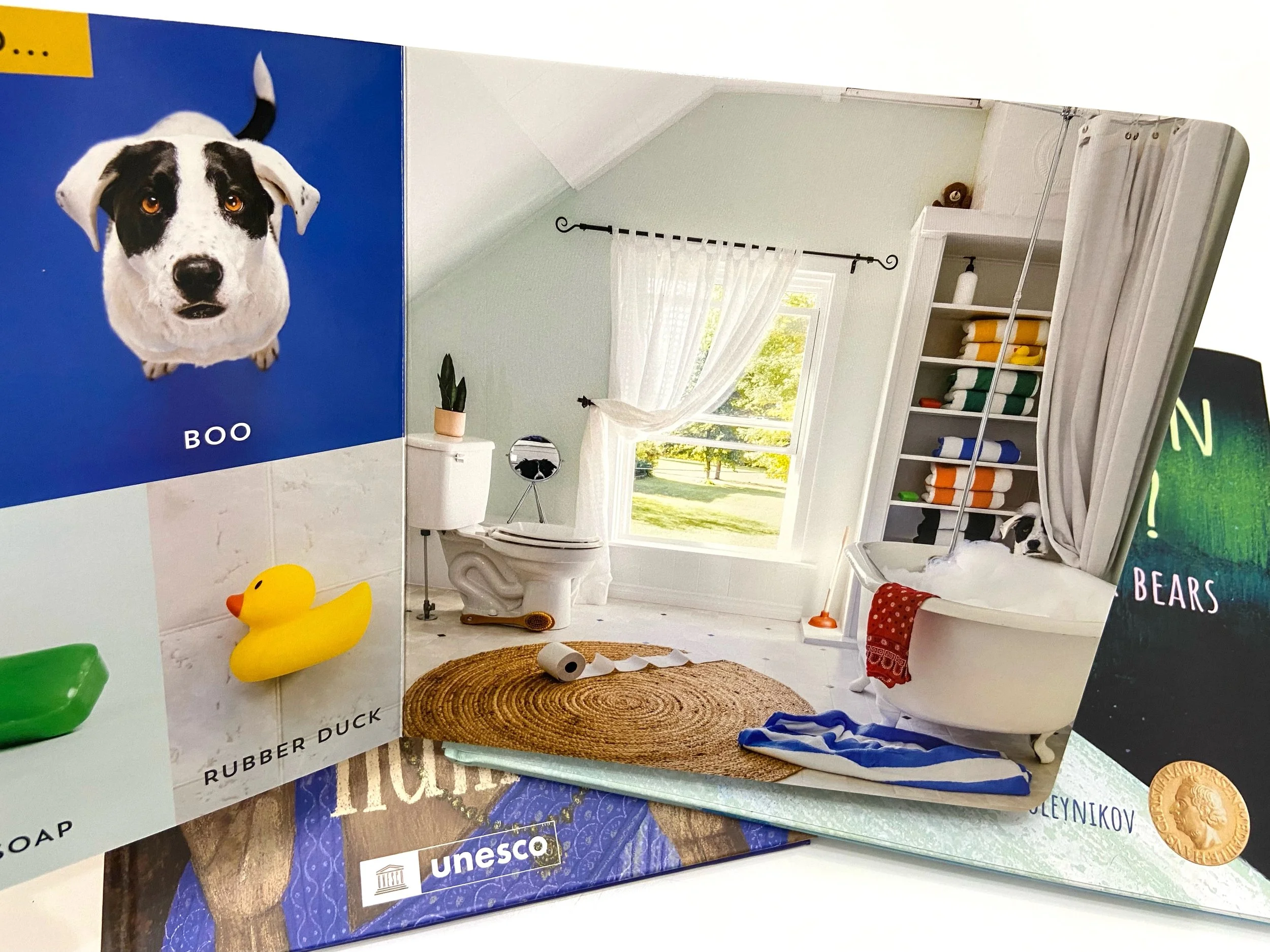 The book features real photography of the dogs Yaya and Boo hiding the best they can. The genius is not just in the concept, but in the execution. Yaya and Boo hide in some truly silly locations. I think my personal favorite is on top of the kitchen cabinets! This is basically the perfect introduction to seek and finds. I can’t imagine a much better option for little dog lovers, or a much better quick activity for you and your little one. Even my 7-year-old liked looking through this wonderful book with me. What a fantastic creation.