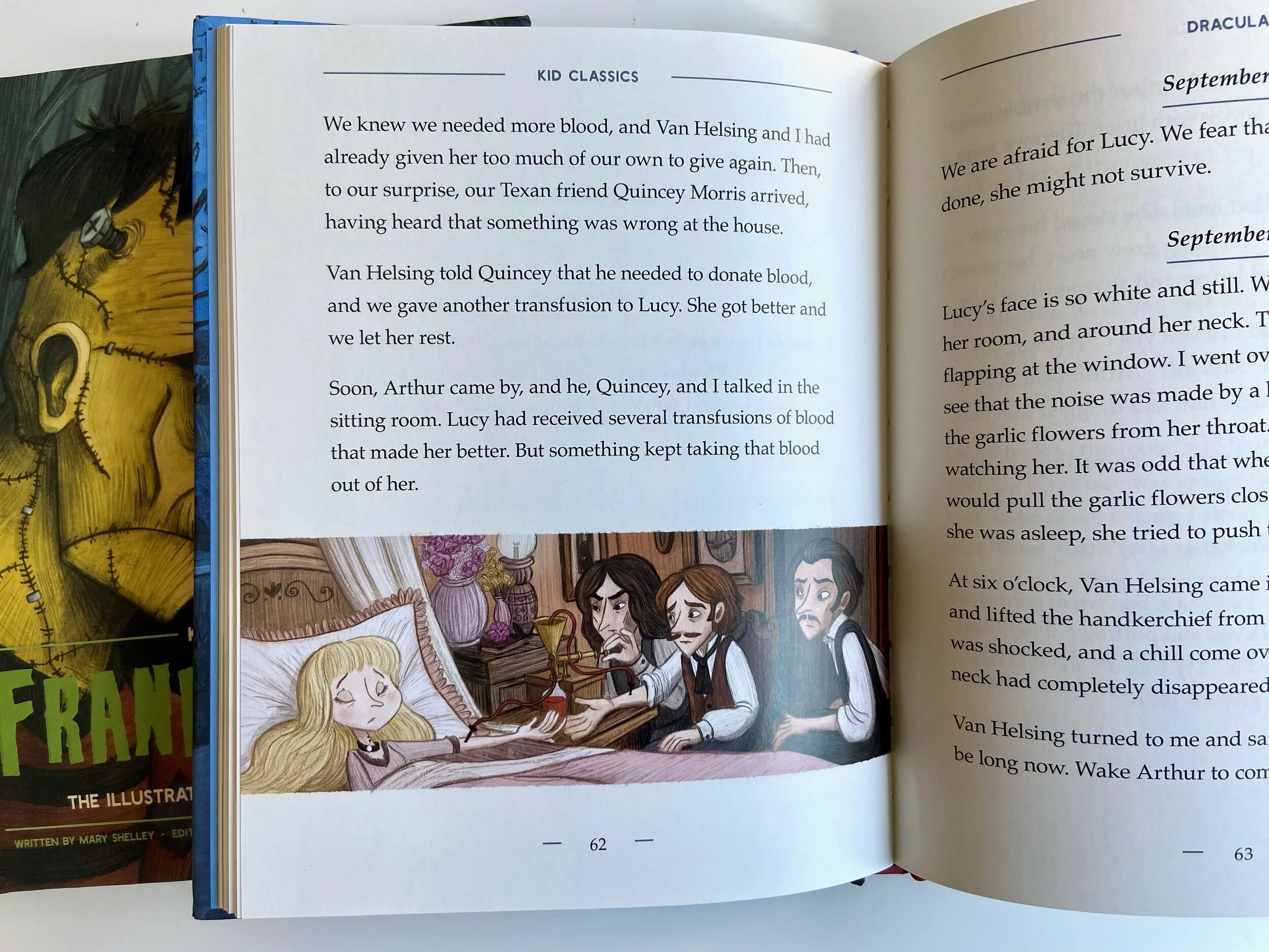 So when I first saw the announcement this year for brand new editions of Dracula and Frankenstein - published by Whalen Book Works, abridged by Margaret Novak, and illustrated by MaΓ―tΓ© Schmitt - I was ecstatic when I noticed that they were also the first books christened with the name of a new series: βKids Classicsβ or βThe Illustrated Just-For-Kids Edition.β I immediately thought this looked like prime collecting material - and, yes, their colorful spines do look great side by side!