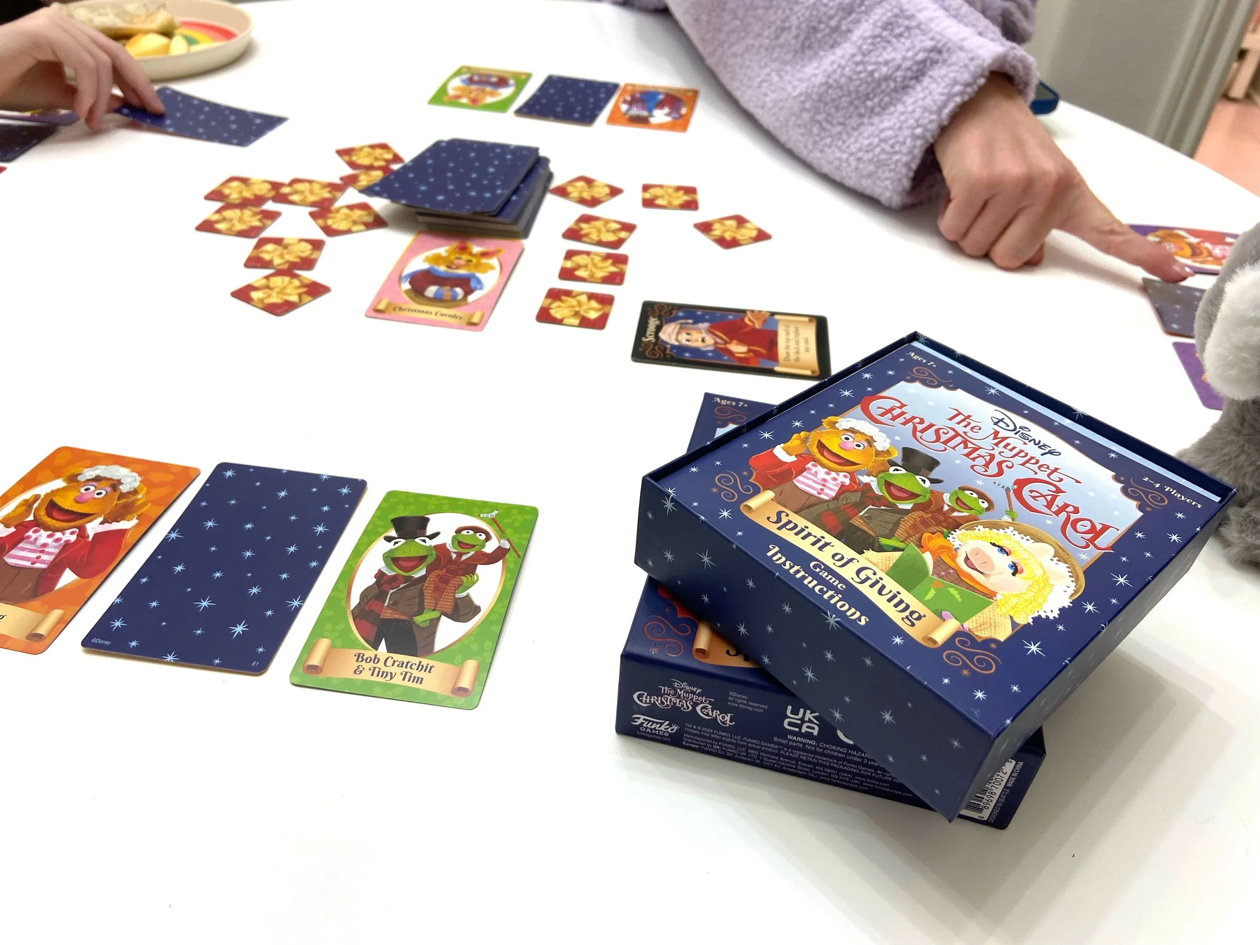 The Muppet Christmas Carol is a set-making game, but you aren’t merely trying to complete a set of 3 cards for yourself. You can also complete the 3-card sets of your opponents. Completing your own set (3 of the same color or 3 of the same character) allows you to draw a random present worth a random number of points.
